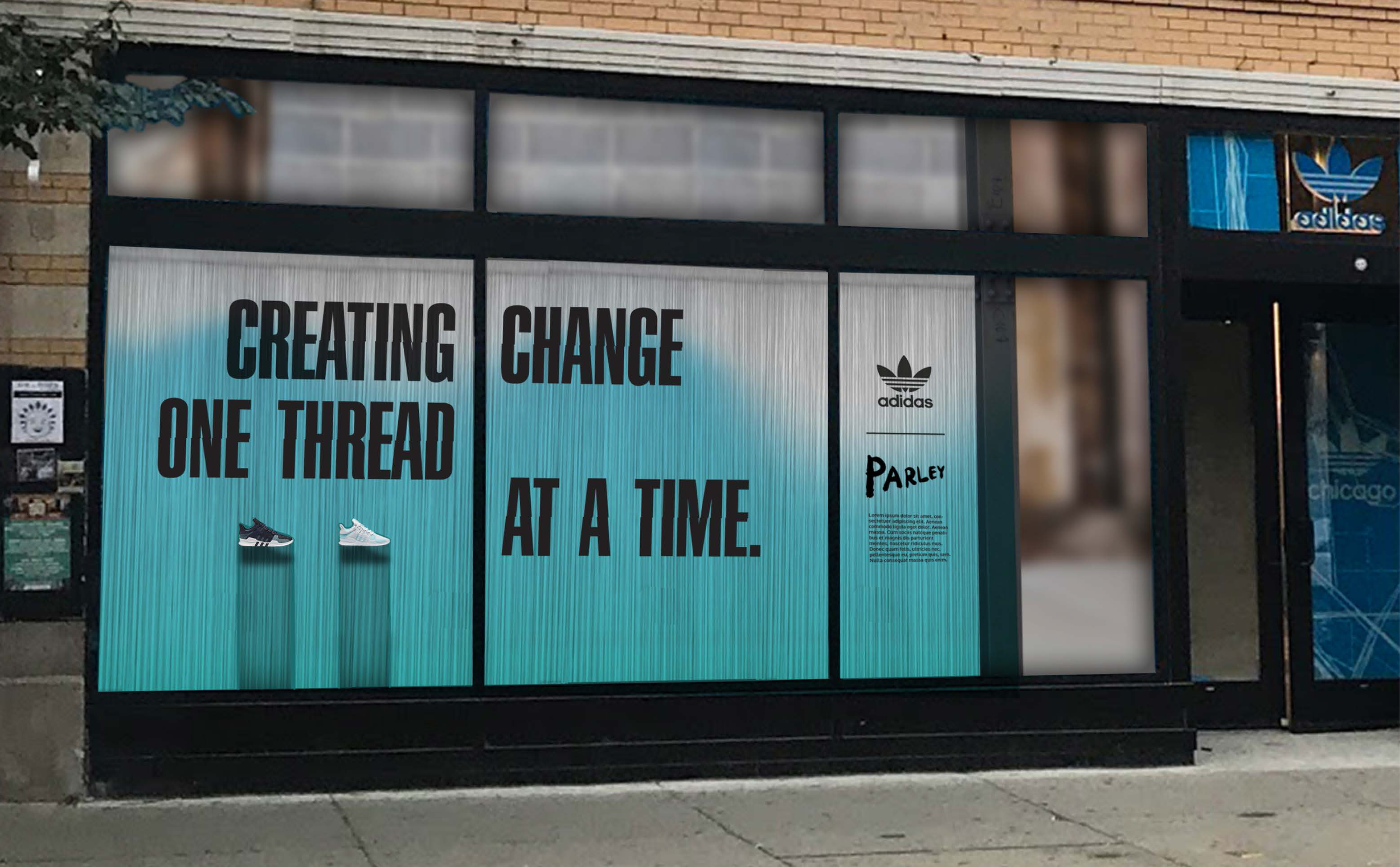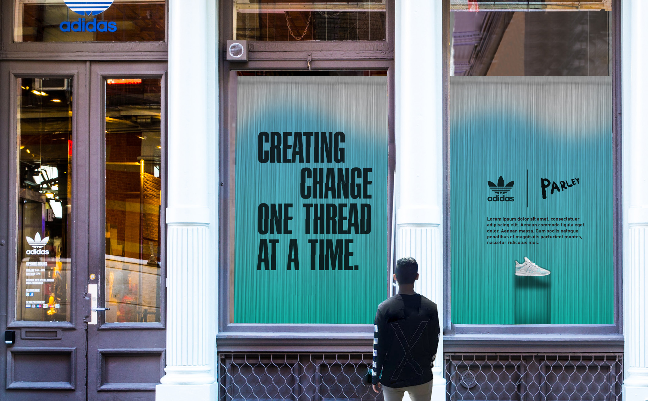 Up-cycled, artfully installed threads reinforce the message, “creating change one thread at a time,” and reference the Parley sneaker’s innovative construction, made with recycled ocean plastic.